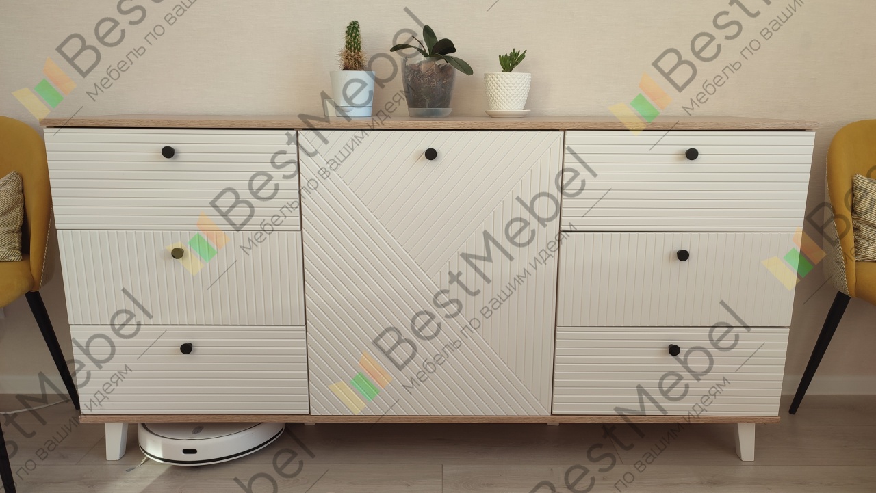 Комод очень понравился. Искали максимально длинный комод, во всю стену и чтобы подошел к интерьеру. Заменили одну полку в центральном отделении на три (добавили две дополнительные). Удобно, что у модели есть ножки и можно выбрать их высоту, чтобы прошел робот-пылесос. Сделан качественно, хорошие материалы, фрезировка фасадов выглядит отлично. Заказ 00000183333