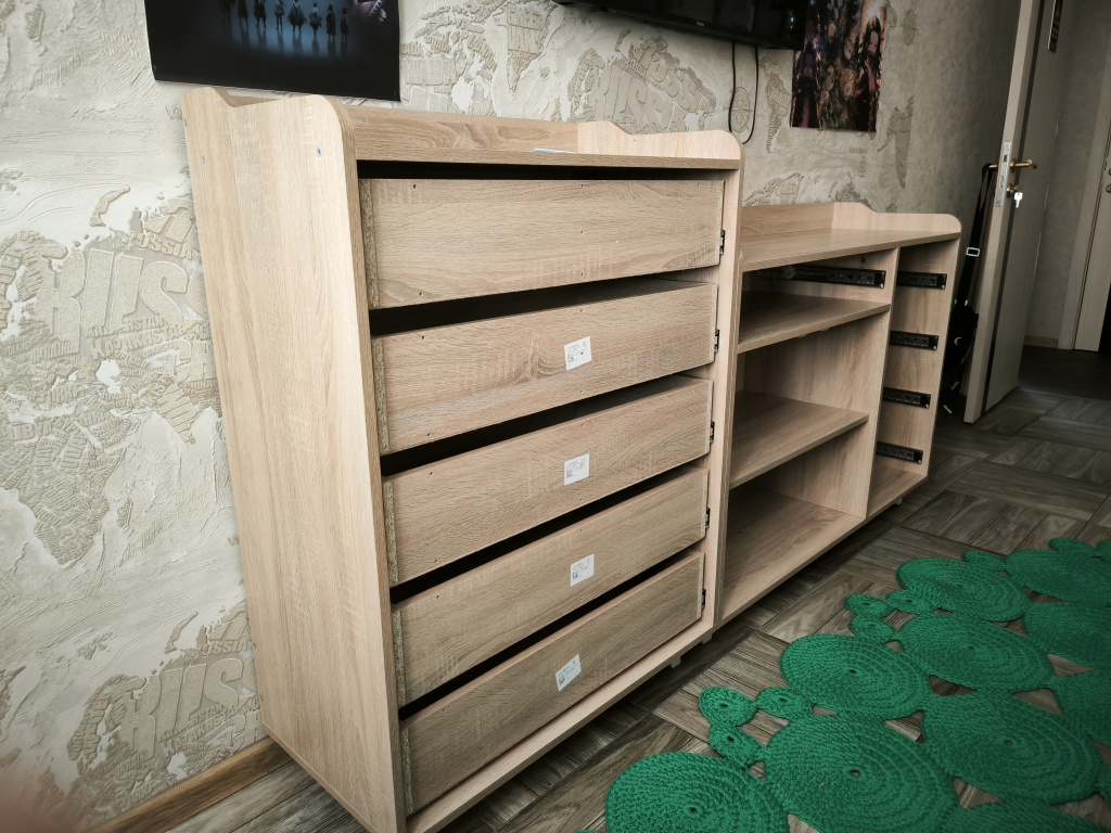 По опыту с компьютерным столом знал, что сборку надо начинать с получения цветной схемы, т.к. с приложенным чертежом ничего не получится. Отдельная история - это доставка, где экспедитор не знает количество упаковок, однако все прошло гладко.В итоге я разложил все детали по двум отдельным кучкам, соответствующие каждому комоду. Выяснилось, что даже на цветной схеме не указано 3 позиций, пришлось обращаться в гарантийный отдел. Собрал довольно быстро, благо есть опыт сборки мебели. В целом комоды понравились, есть конечно некоторые недочёты. Кстати, для ножек (которых 9) нет подпятников, чтобы не царапать пол