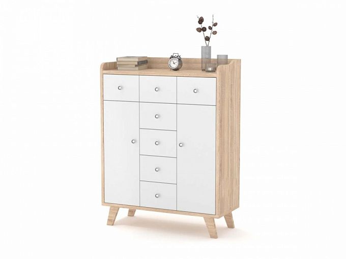 Комод Лоренцо 18 BMS – это удобные средние габариты, визуальная легкость и функциональность. Модель в популярном скандинавском стиле располагается на высоких скошенных опорах и выполнена в характерном сочетании светлых древесных тонов и белого. Особенность комода – удобная система хранения из семи выдвижных ящиков и двух распашных отделений, а также широкой, ограниченной бортиками столешницы. Купить комод Лоренцо 18 BMS и компактно разместить множество мелочей вам поможет наш интернет-магазин.