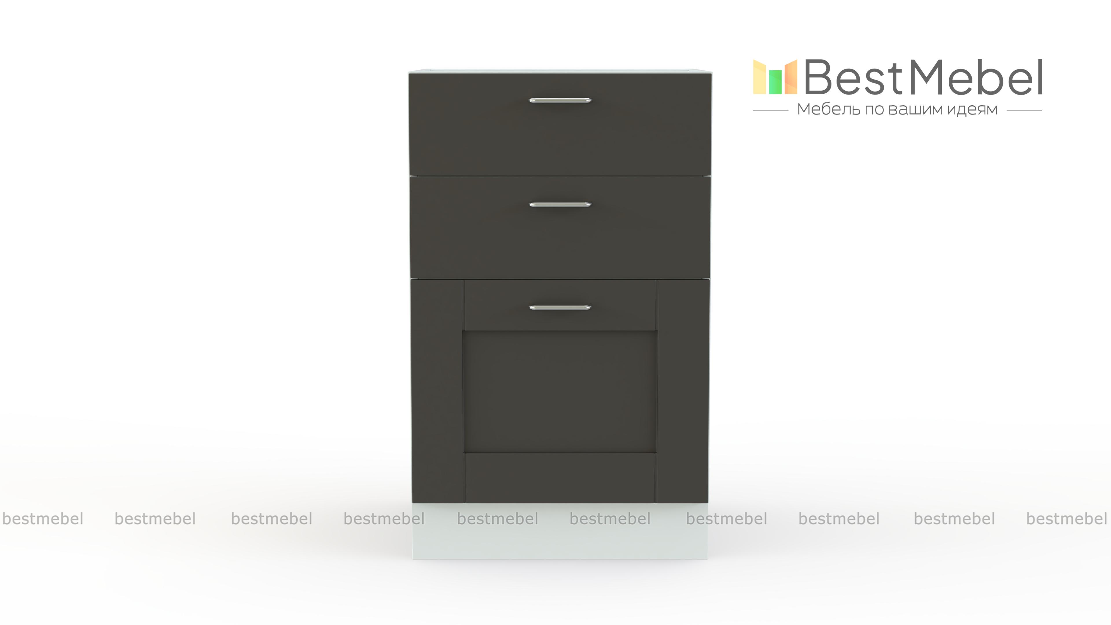 Шкаф нижний с 3-мя ящиками Лофт BMS поможет систематизировать хранение мелочей и сократить время на поиски нужной вещи. Шкаф выполнен в современном стиле и дополнит нижний ряд модулей кухонного гарнитура. Широкая модель оборудована тремя выдвижными ящиками разной высоты, в которых без труда разместится все необходимое. Фасады в матовом графитовом оттенке декорированы массивными ручками. Купить шкаф нижний с 3-мя ящиками Лофт BMS по демократичной цене вы сможете в нашем интернет-магазине.