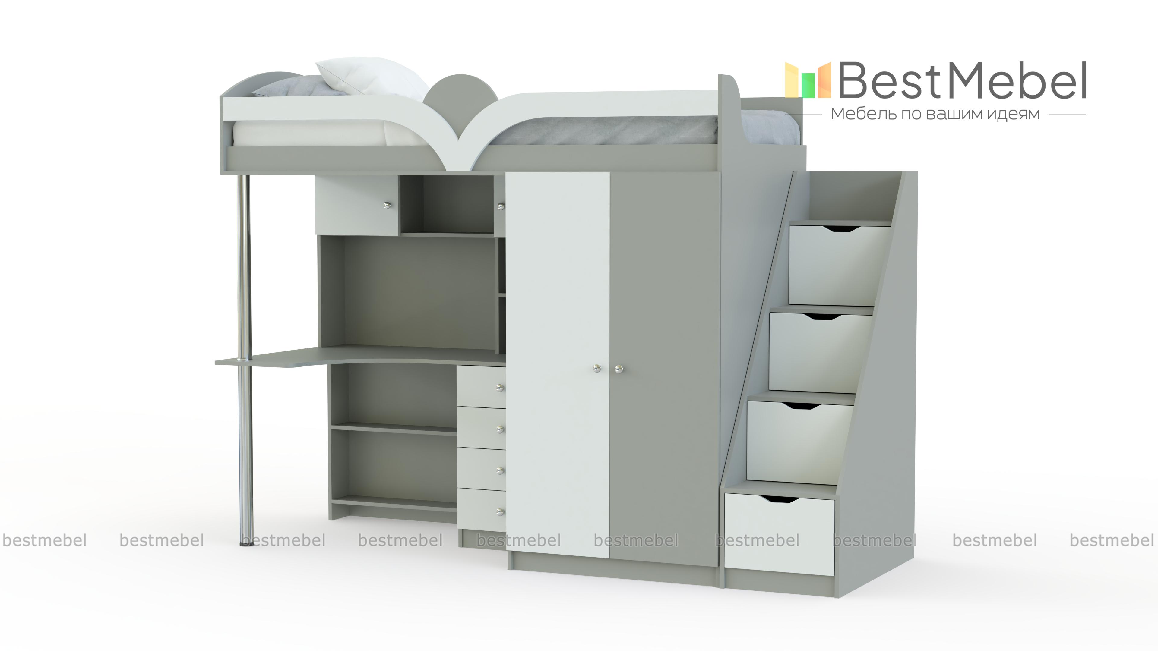 Кровать-чердак с рабочей зоной Мираж К-32 BMS предназначена для меблировки малогабаритных квартир и включает в себя все необходимое ребенку для полноценного отдыха, учебы и хранения вещей. Многофункциональный комплект состоит из кровати с защитным скругленным бортиком, лестницы-комода, распашного платяного шкафа и рабочей зоны со столом, тумбой и надстройкой с полками. Корпус светлых древесных тонов сочетается с контрастными фасадами. Купить кровать-чердак с рабочей зоной Мираж К-32 BMS вы сможете в нашем интернет-магазине, подобрав цветовое решение.