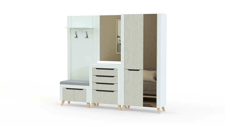 Прихожая Династия 20.3 BMS – стильное и функциональное решение для входной зоны. Нарочито простые модули с широкими накладками на фасадах не выглядят громоздко благодаря 3D фрезеровке и зеркалам, а модную геометричность дизайну придают трапециевидные ручки-вырезы. В комплект входят открытая вешалка, совмещенная с обувницей, распашной шкаф, комод и большое навесное зеркало. Купить прихожую Династия 20.3 BMS приглашаем в наш интернет-магазин с возможностью изготовления по индивидуальным размерам.