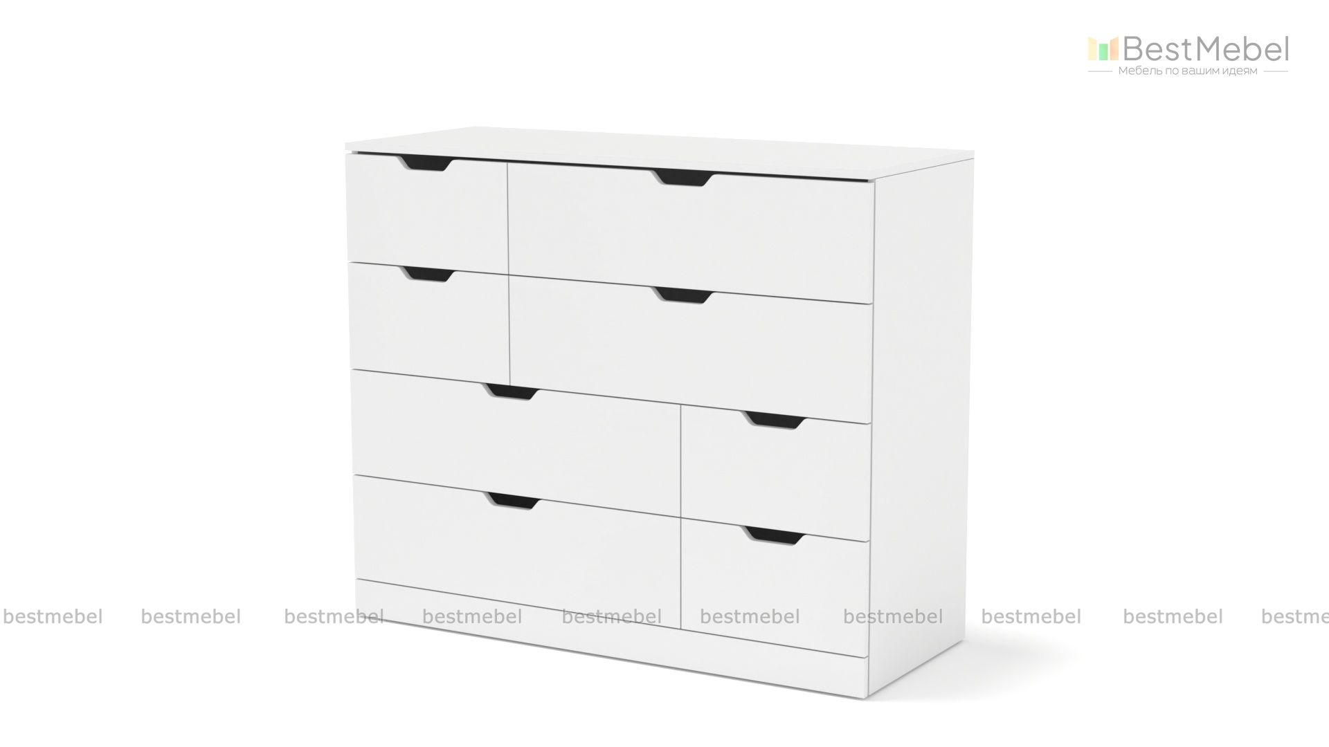 Комод Нордли Nordli 4 с асимметричным расположением ящиков воплощает современные дизайнерские тренды. Выдвижные ящики разных размеров – четыре больших и четыре малых, позволяют разместить как всевозможные мелочи, так и более габаритные вещи. Трапециевидные ручки-вырезы на светлых гладких фасадах необычно выглядят и комфортны в повседневной эксплуатации. Купить комод Нордли Nordli 4 в гостиную, спальню или прихожую,