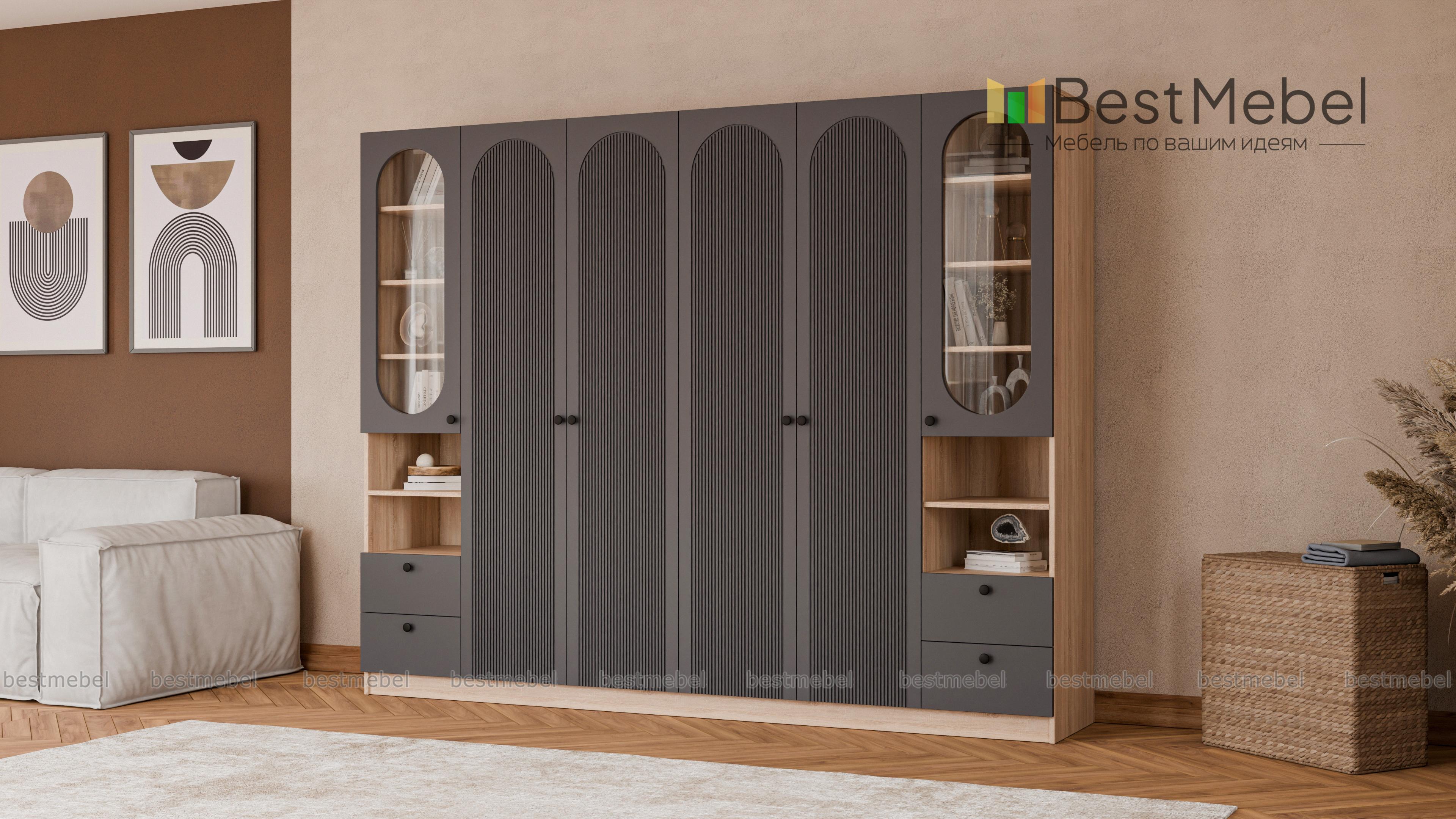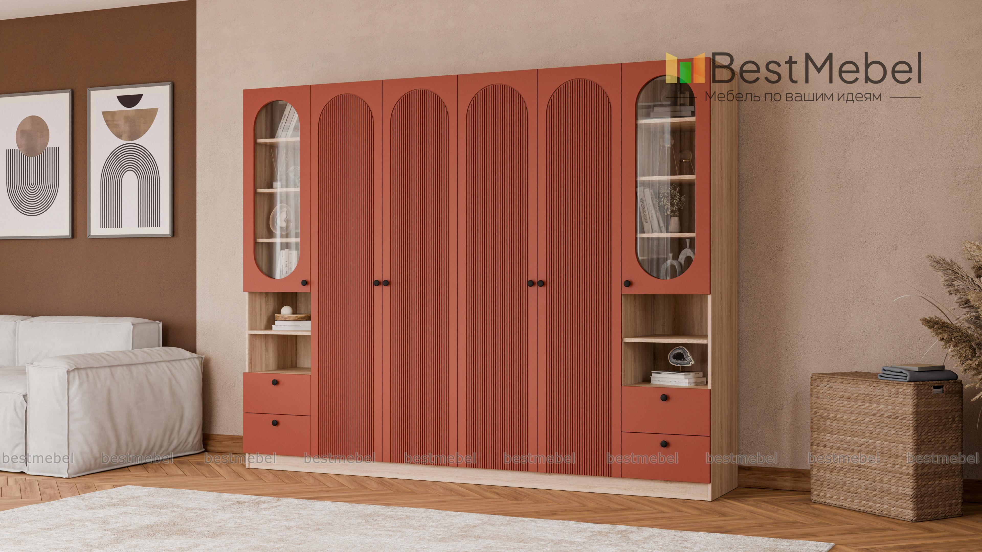 Шкаф распашной Рене 16 BMS представляет собой комбинацию двух платяных отделений в центре и двух витрин. Габаритная конструкция не выглядит громоздко благодаря светлому оттенку корпуса и фасадов, изящной фрезеровке арками и овальным вырезам. Разноплановые отделения позволяют разместить как одежду, так и книги, бокалы, всевозможные мелочи и интерьерные аксессуары. Купить шкаф распашной Рене 16 BMS вы сможете в нашем интернет-магазине с изготовлением по индивидуальным размерам.