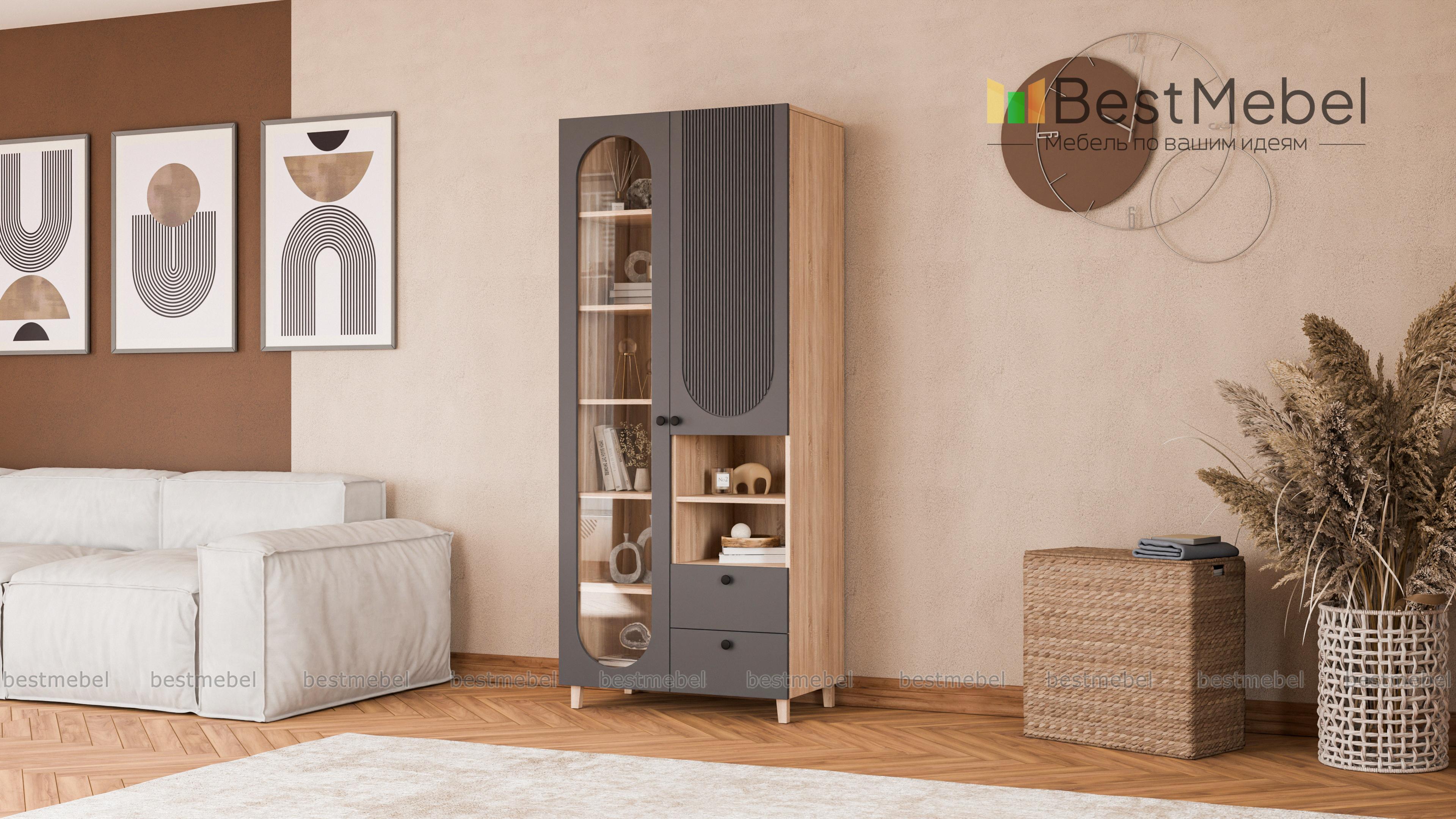 Шкаф распашной Рене 6 BMS с фактурным фасадом органично вписывается в пространство современной квартиры. Лаконичный силуэт с высокими ножками сочетается с оригинальным геометричным декором. Овальный вырез витрины слева дополняет закрытое отделение справа, секция с полкой для открытого хранения и два вместительных выдвижных ящика под мелкие вещи. Купить шкаф распашной Рене 6 BMS вы сможете в нашем интернет-магазине, подобрав размеры, цвет и фурнитуру.