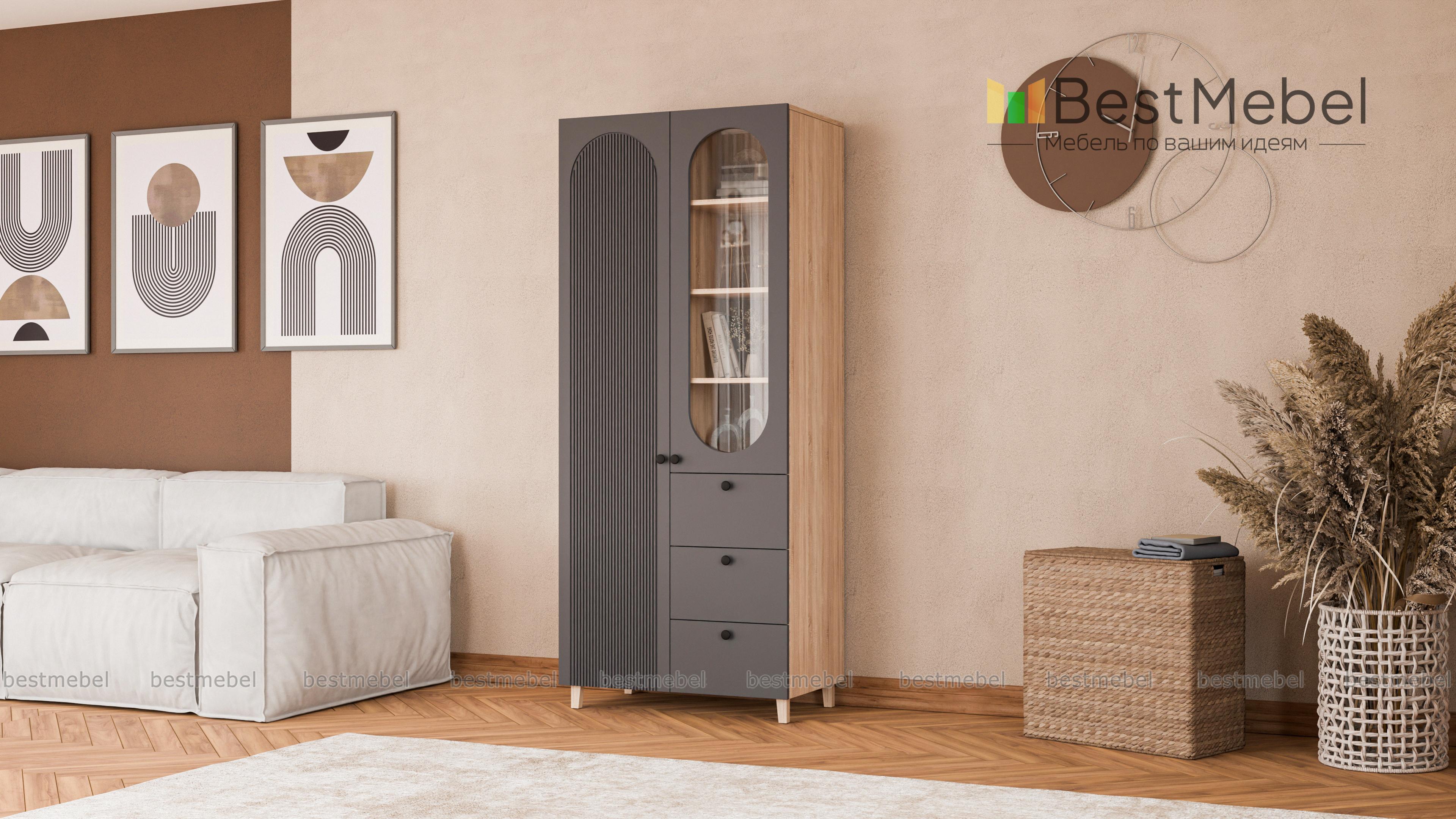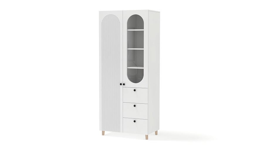 Шкаф распашной Рене 8 BMS при своих скромных размерах учитывает самые разные потребности в хранении. Для одежды, книг, важных мелочей и декора предусмотрены закрытое отделение слева, витрина и три выдвижных ящика. Гармонично смотрится сочетание светлой отделки с деревянными ножками, а овальные вырезы и фрезеровка придают этой современной модели элегантность классики. Купить шкаф распашной Рене 8 BMS вы сможете в нашем интернет-магазине, по желанию изменив цвет и размеры.