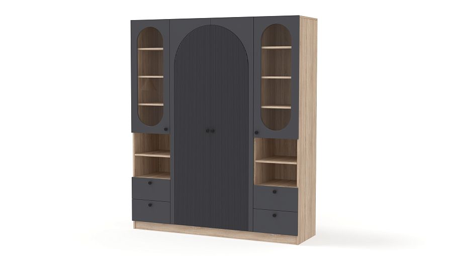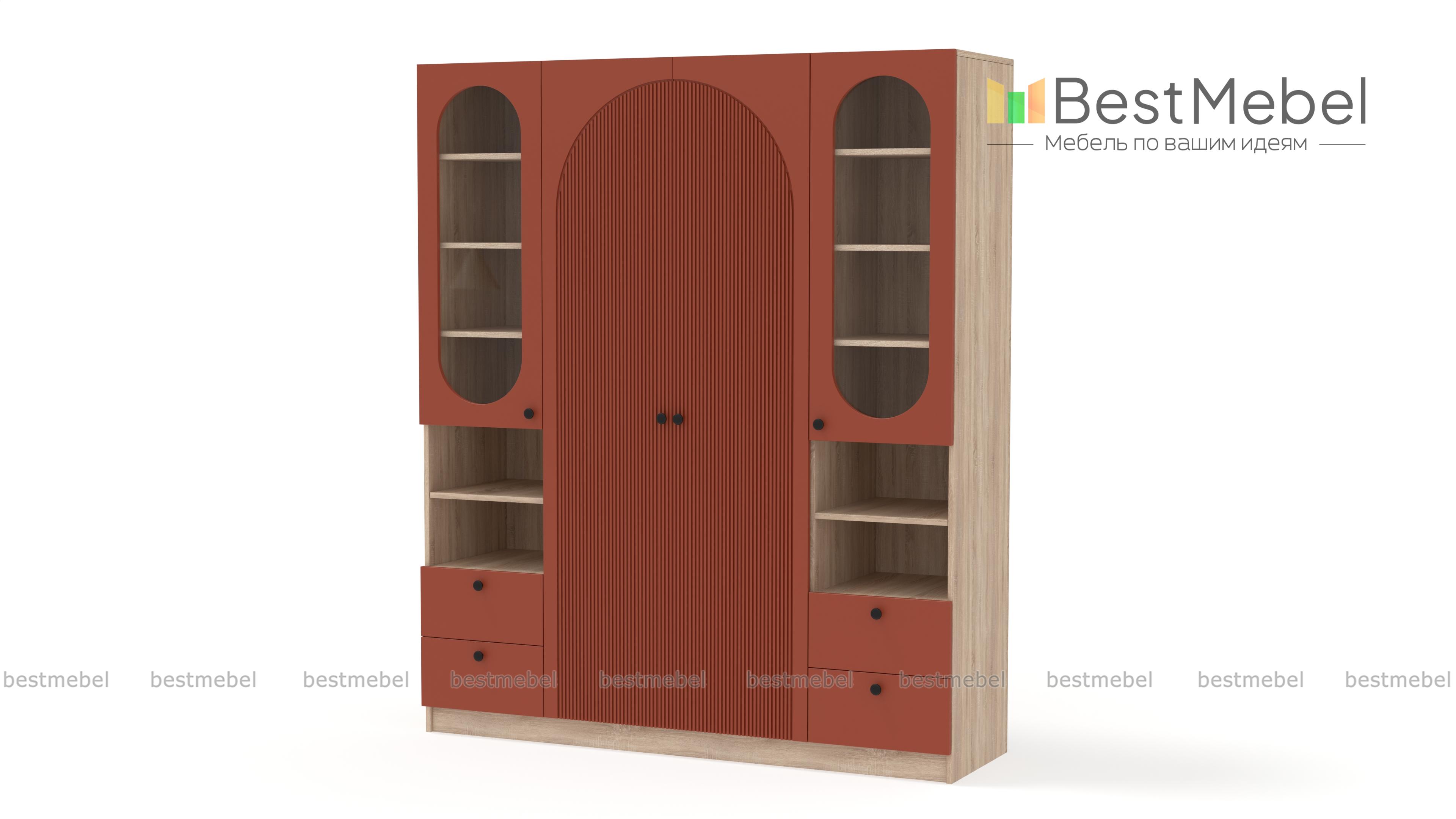 Шкаф распашной Вивьен 24 BMS дополнен двумя комбинированными секциями справа и слева. Система хранения с витринами, полками и ящиками позволяет разместить не только одежду и обувь, но и книги, интерьерные украшения, органайзеры с мелочами. Украшенный арочным вырезом, рельефом и овальными стеклянными вставками фасад выполнен в стильном темном оттенке из плиты МДФ. Купить шкаф распашной Вивьен 24 BMS вы сможете в нашем интернет-магазине с изготовлением по индивидуальным размерам.