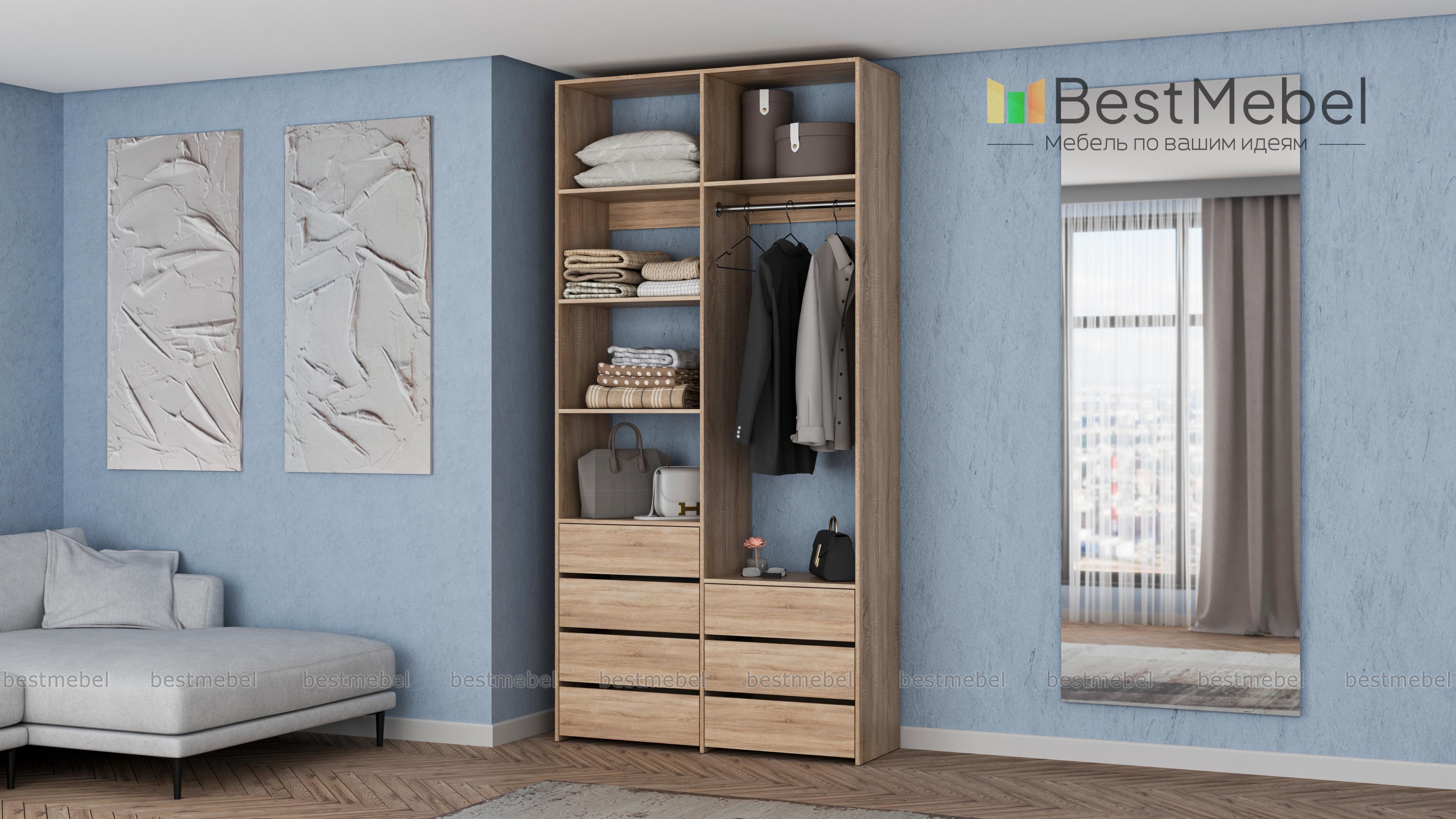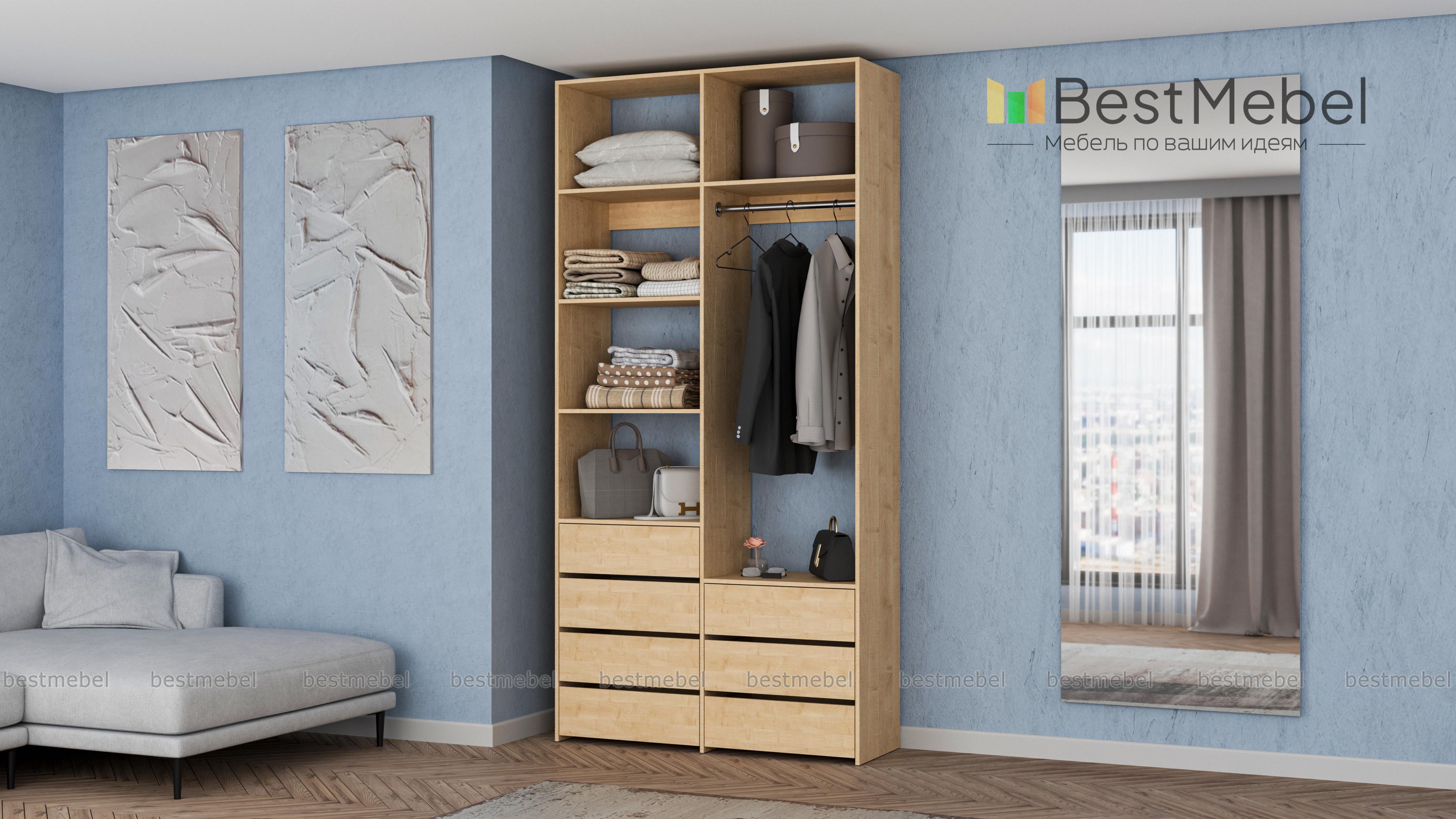 Стеллаж для одежды Мирта 41 BMS позволит вам зонировать пространство для хранения. Компактная двухсекционная конструкция разделена на отсек для вешалок, бельевые полки и два ряда выдвижных ящиков — под аксессуары, трикотаж и другие мелкие вещи. Для простого функционального дизайна стеллажа оптимально подходит светлый базовый оттенок. Купить стеллаж для одежды Мирта 41 BMS вы всегда сможете на сайте нашего интернет-магазина, по желанию изменив цвет и размеры.
