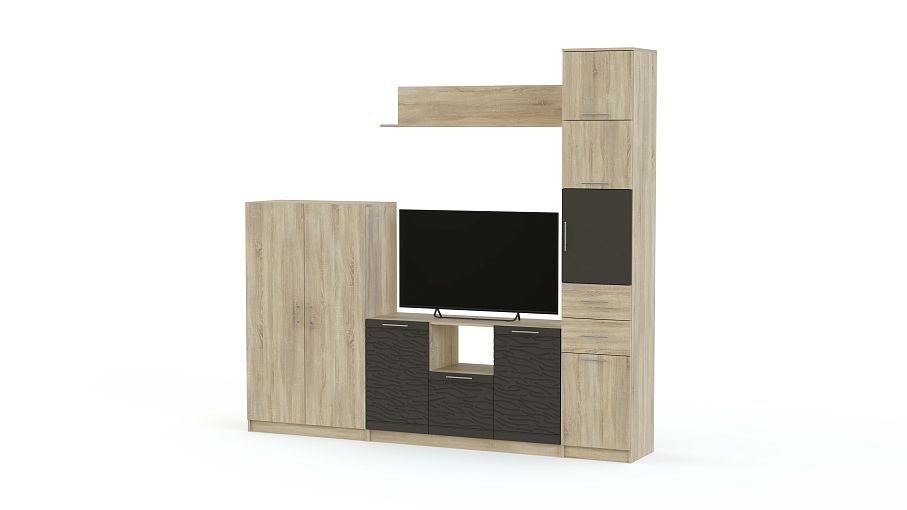 Стенка Вельвет 4 BMS – модульная композиция для светлого и визуально легкого современного интерьера. Поклонникам минимализма придутся по душе простота формы и высокая функциональность. Комплект оборудован высокой комбинированной колонкой, вместительной тумбой под ТВ, распашным комодом и навесной открытой полкой. Особенно эффектный вид стенке придают разноуровневость и сочетание древесных тонов с темными фасадами, декорированными рельефным рисунком. Купить стенку Вельвет 4 BMS, стильную и надежную, вам поможет наш интернет-магазин.