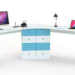 Угловой письменный стол для двоих Нико 83 BMS – практичное решение для меблировки детской. Визуально легкая и компактная, модель не занимает много места и позволяет разместить за учебой или творческими занятиями сразу двоих детей. Просторная, безопасно скругленная по углам столешница дополнена в центральной части широкой тумбой с двумя рядами выдвижных ящиков. Купить угловой письменный стол для двоих Нико 83 BMS, выполненный в контрастной гамме, приглашаем в наш интернет-магазин.