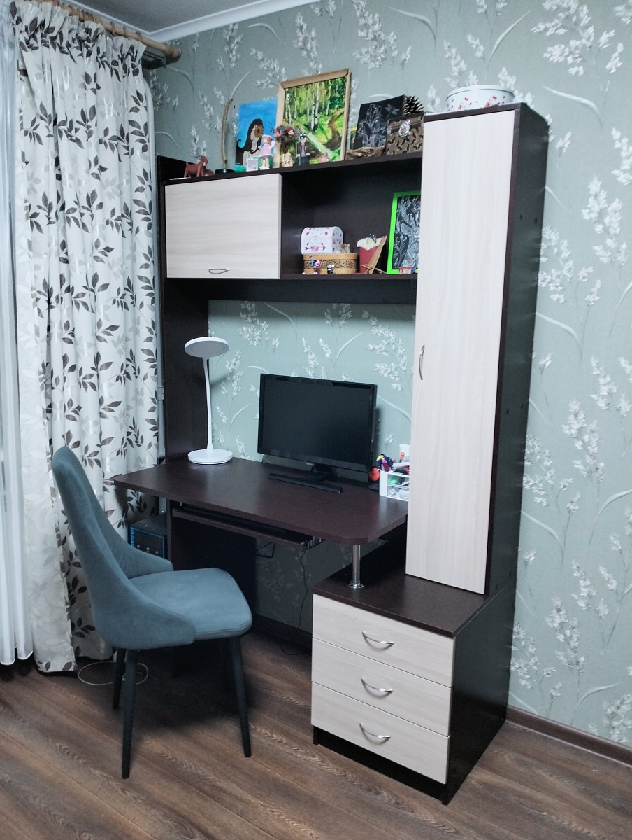 Заказ 00000154493. Заказала стол с пеналом Руби-1. Стол просто суперский! Очень понравилась возможность на сайте выбрать самой количество полок;  толщину столешницы, возможность добавить  выдвигающуюся полочку под клавиатуру, также можно выбрать фурнитуру, размеры, цвет. Сразу можно добавить спил под плинтус. Очень удобный сайт. И мебель очень хорошая. Поместились все школьные принадлежности, и осталось место под девичьи безделушки