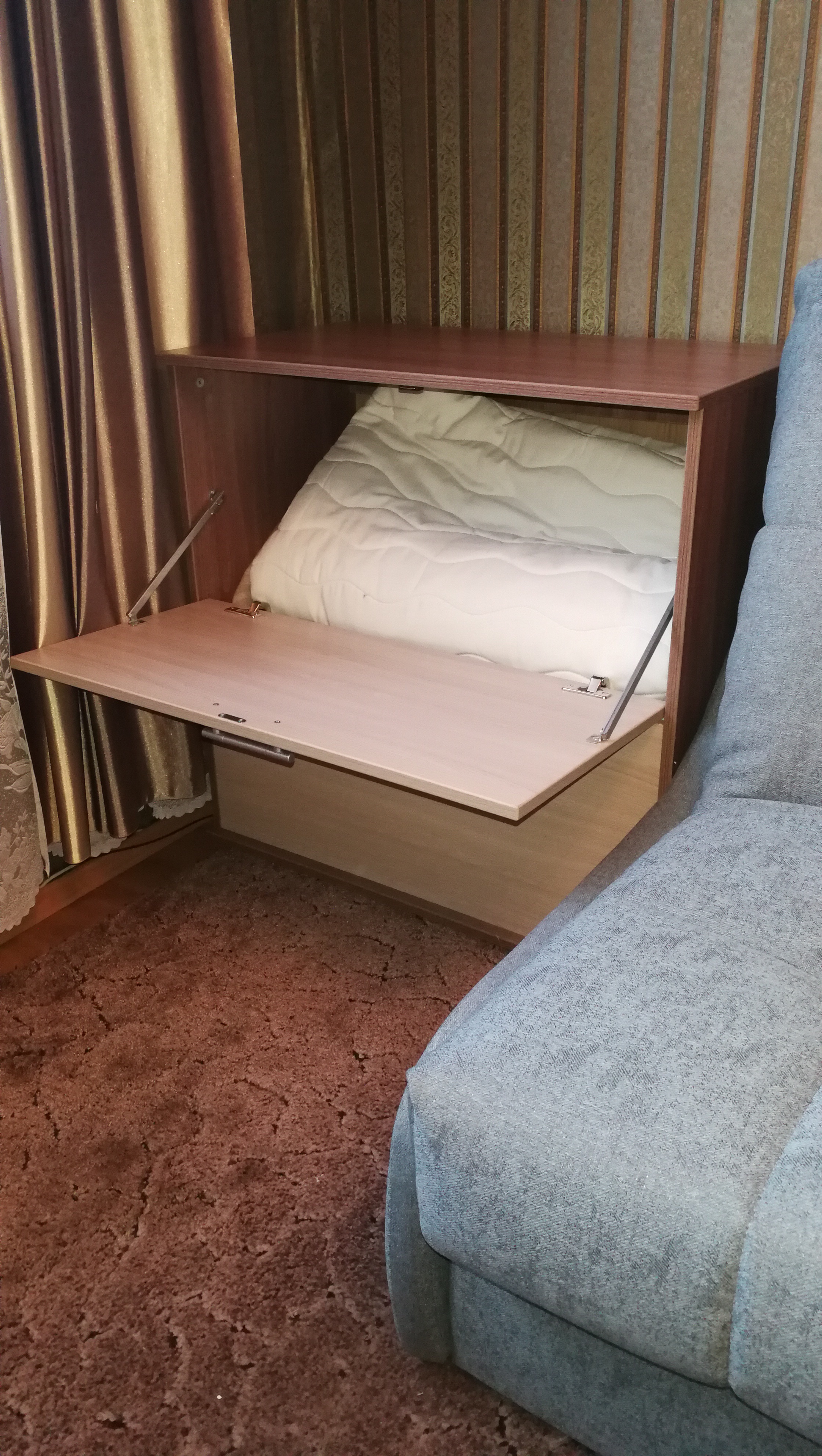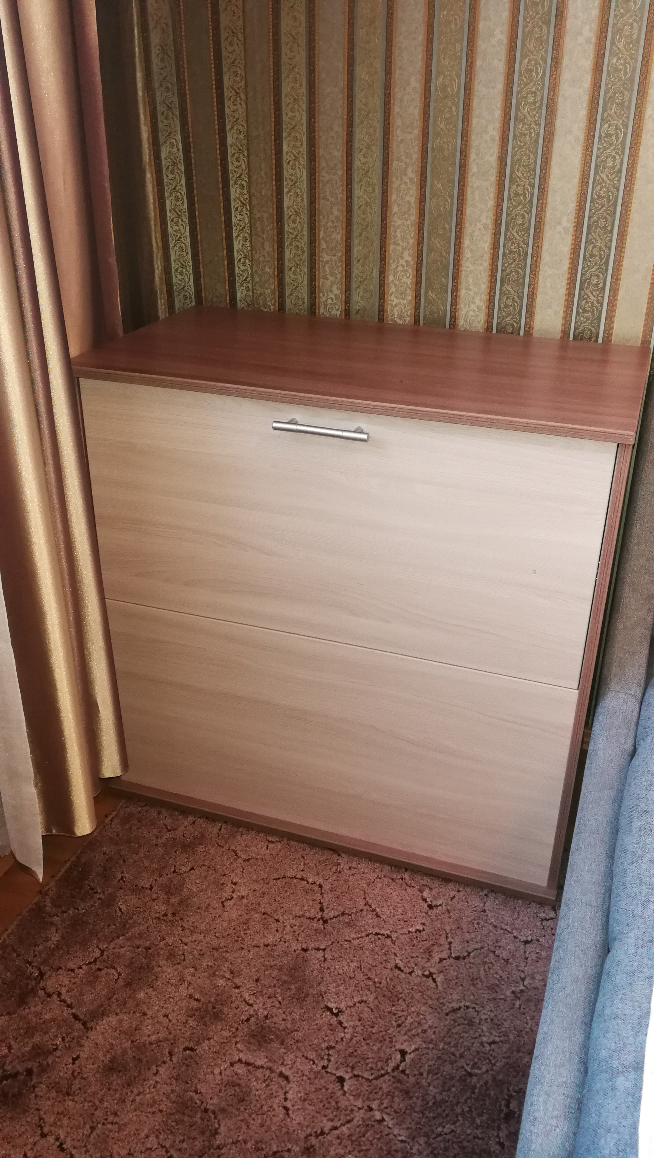 Положительно:Присматривал тумбу для белья (бельявица). Чтобы довольно вместительная была. Конечно искал с верхней загрузкой, но не нашлось. Остановился на  модели КП-3, которая есть во многих интернет магазинах мебели. Цена везде одинаковая +-200р. Но выбор остановился на этом магазине, т.к. здесь можно изменять цвет, размер и фурнитуру изделия и другие параметры (кстати это здесь применимо к большинству мебели). В итоге подобрали цвет, выбрал толстую 2мм кромку по всем видимым деталям. Цена конечно выросла в основном из-за кромки, но оно того стоит. Отдельно такую кромку купить проблемно, чтобы самому приклеить.Получил заказ в указанные сроки.Кстати петли дали не простые, не те что были в заказе и вообще при выборе, но они с доводчиком оказались. Собрал тумбу без проблем. В стандартные размеры Ш820-В822-Г450 умещается толстое полуторное одеяло, две средние подушки, наматрасник Лисмарк 140*200 и еще немного места остается.Отрицательно:Был конечно скол покрытия 5*10мм на наружной плоскости дверцы. Но не стал заморачиваться с этим, его не так видно если не присматриваться (на фото можно увидеть справа в центре). Да и доказать брак или при моей сборке проблемно это. Может найду чем затереть скол в цвет...В комплекте идет механизм с фиксацией дверцы, но фиксация там не нужна, она же открывается вниз. При закрытии дверцы приходится делать два движения вверх, а бывает одна только отщелкнется, то приходится "поколдовать" чтобы закрыть. Сюда нужны обычные направляющие без защелки, или газлифты. Но к сожалению выбора/замены этой фурнитуры нет.В целом все устраивает. Главное возможность изменения параметров изделия у многой мебели.